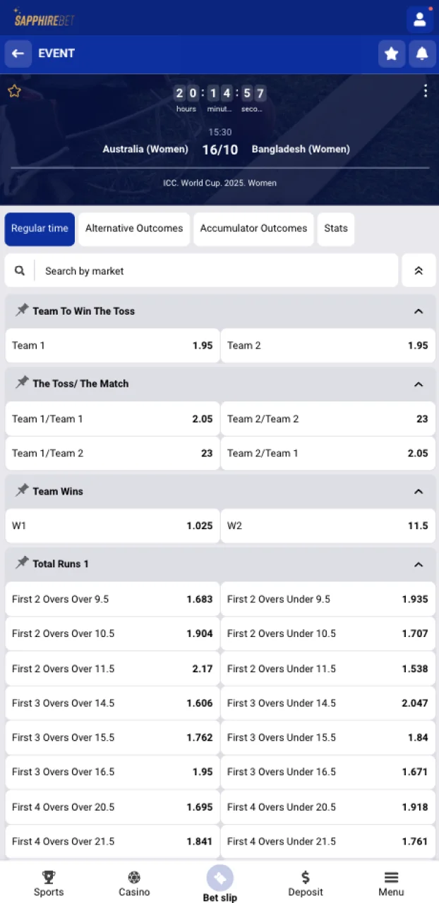 SapphireBet Bangladesh covers global and local sports, strong odds, and a wide market range. You can bet prematch or live and build combos in a click.